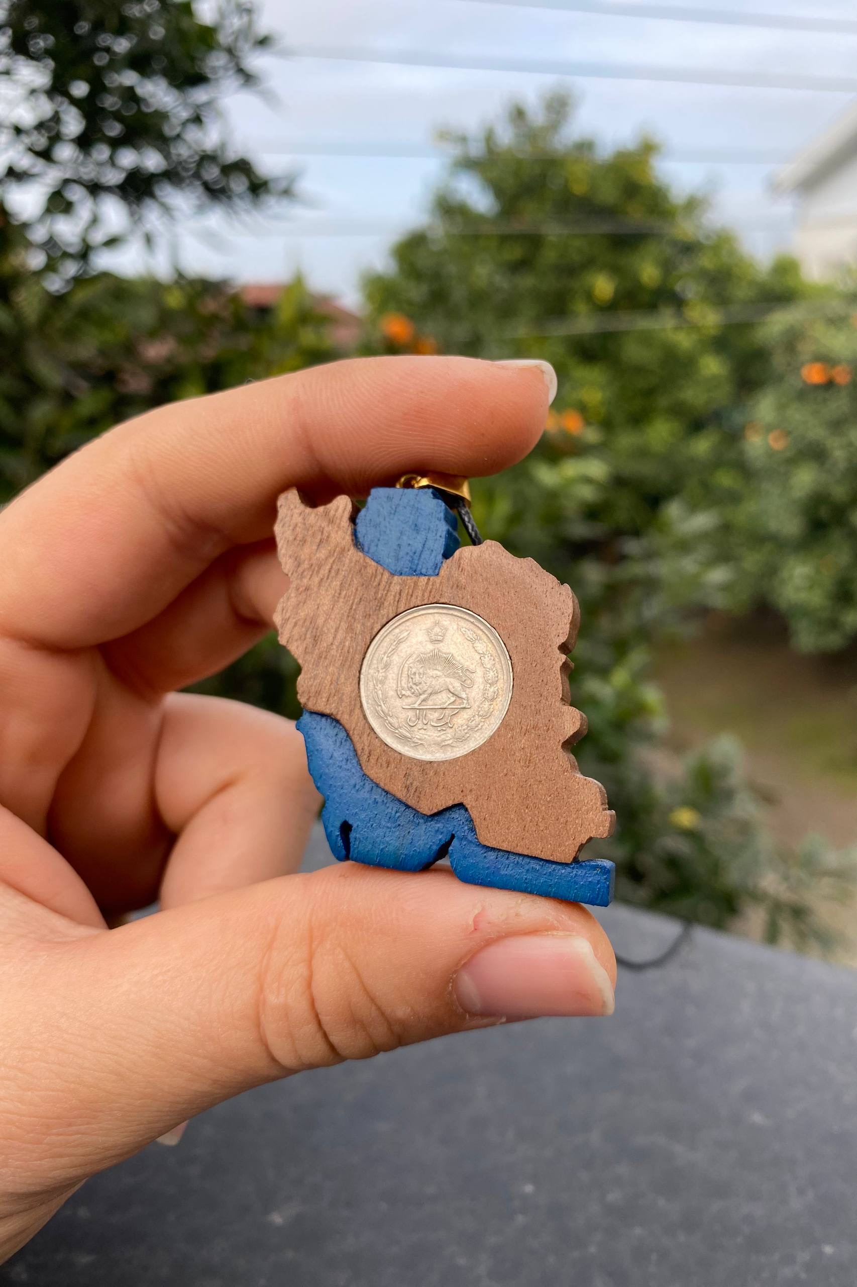 نقشه ایران از چوب طبیعی ساخته شده و در قلب آن سکهای پنجاه دیناری قرار گرفته است