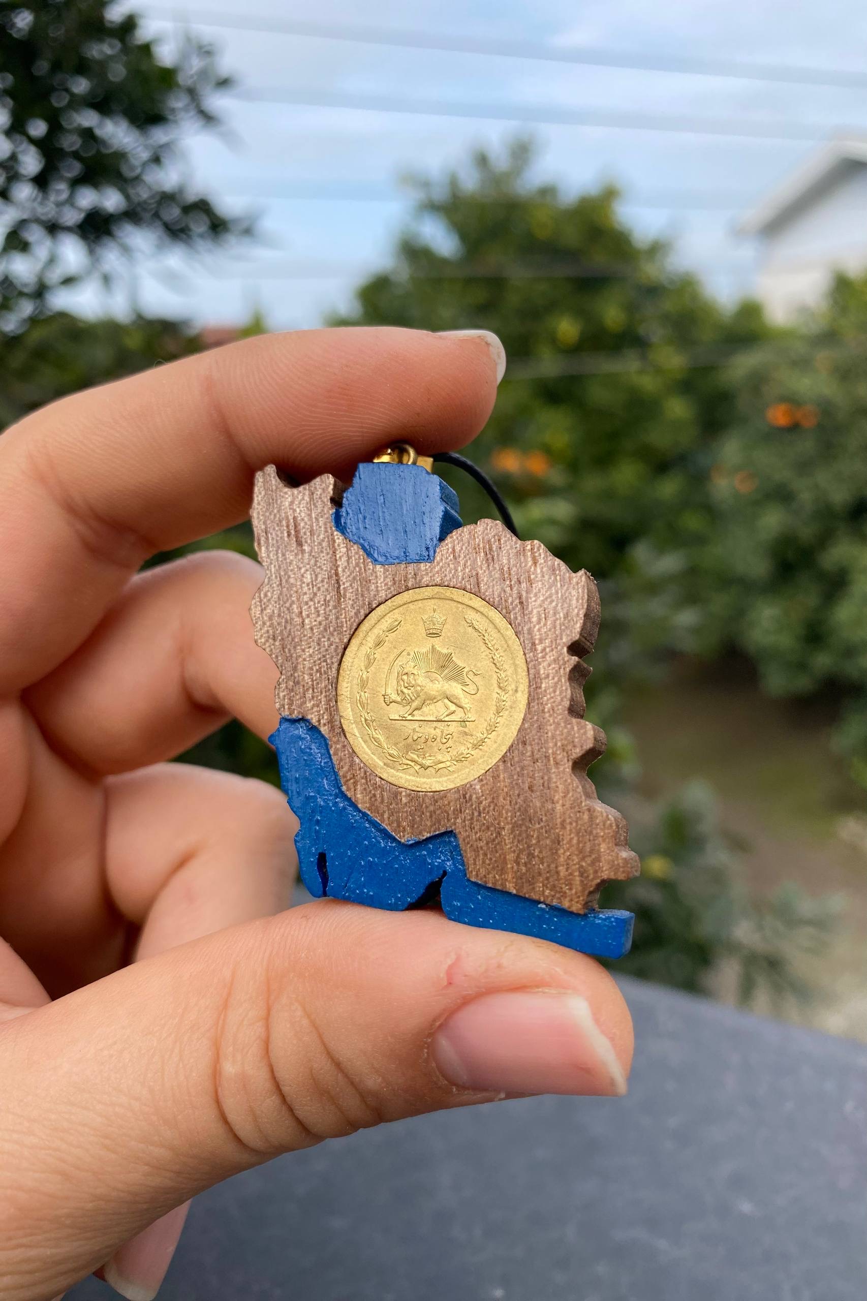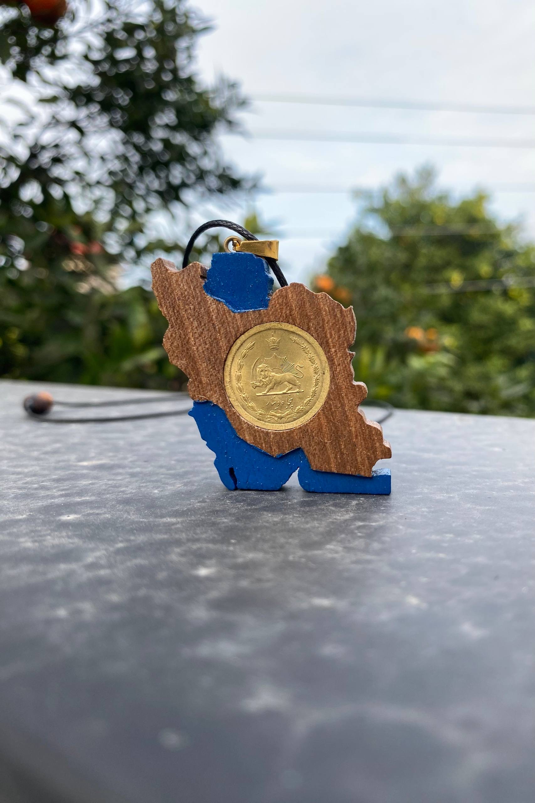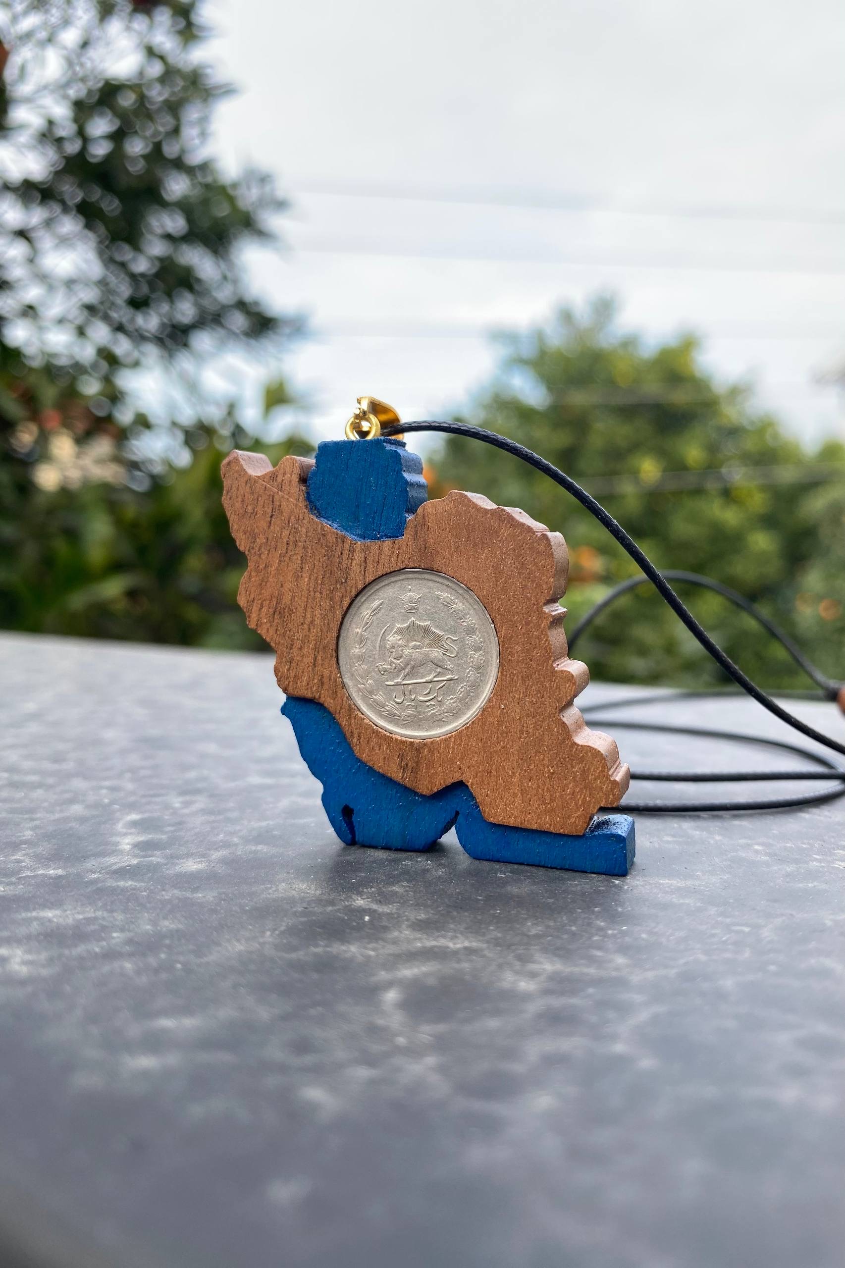 گردنبند نقشه ایران با سکه پنجاه دیناری، اثری خاص و دستساز از کارگاه ملورینا است.